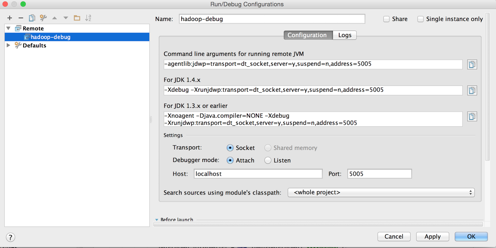 export HADOOP_OPTS="-agentlib:jdwp=transport=dt_socket,server=y,suspend=y,address=5005"
